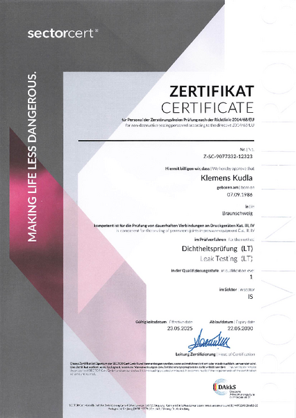 - die Schweißaufsicht die Anforderungen nach AD2000, Merkblatt HP3 und der DIN EN ISO 14731 erfüllt;